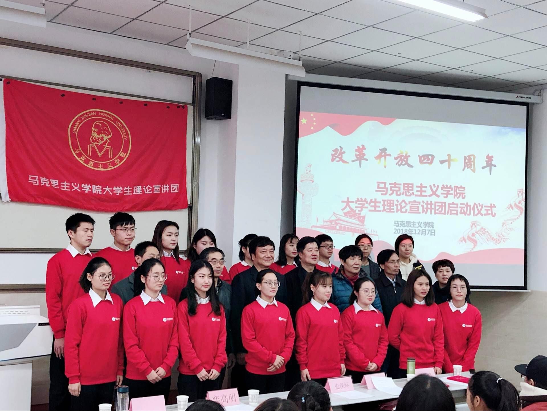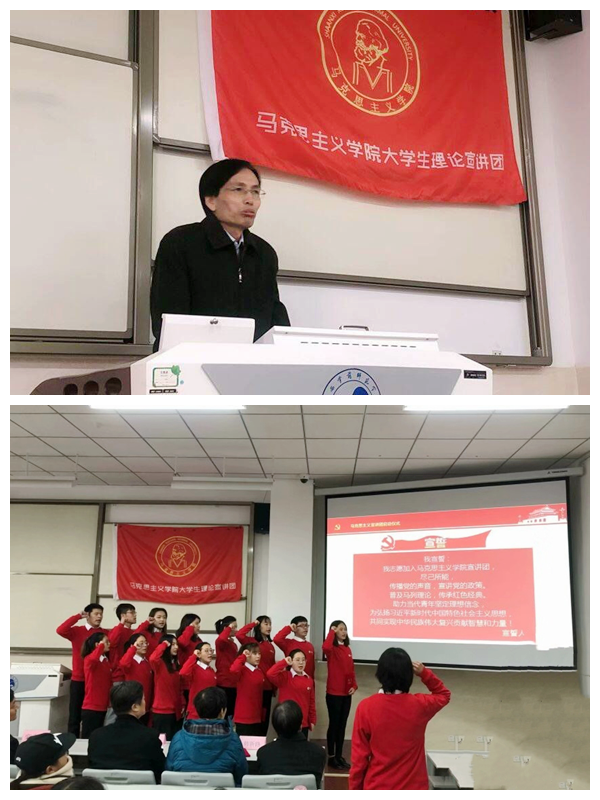 为深入学习、宣传和践行习近平新时代中国特色社会主义思想,宣传党的路线方针政策,充分发挥马克思主义学院学科优势、专业优势,引领全校青年学生成为新时代青年的宣传者和践行者,马克思主义学院经前期精心筹划组建了“大学生理论宣讲团”。12月7日上午,大学生理论宣讲团启动仪式暨首场宣讲会在荣耀(中国)四教楼第五阶梯教室成功举办。校党委副书记栾高明、党委学工部主要负责人,马克思主义学院班子成员、宣讲团导师代表、宣讲团全体成员及马克思主义学院全体学生参加了宣讲会。会议由马克思主义学院党总支副书记高萍主持。