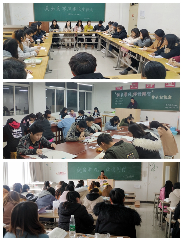 为进一步激发学生学习动力,明确学习目标,加强学风建设,全力迎接本科教学合格评估,美术系于12月6日中午12:00在3号教学楼304教室召开了“学风建设大讨论”师生座谈会暨迎评促建工作动员会。美术系党总支副书记、全体辅导员及各班级学生代表参加了座谈会。