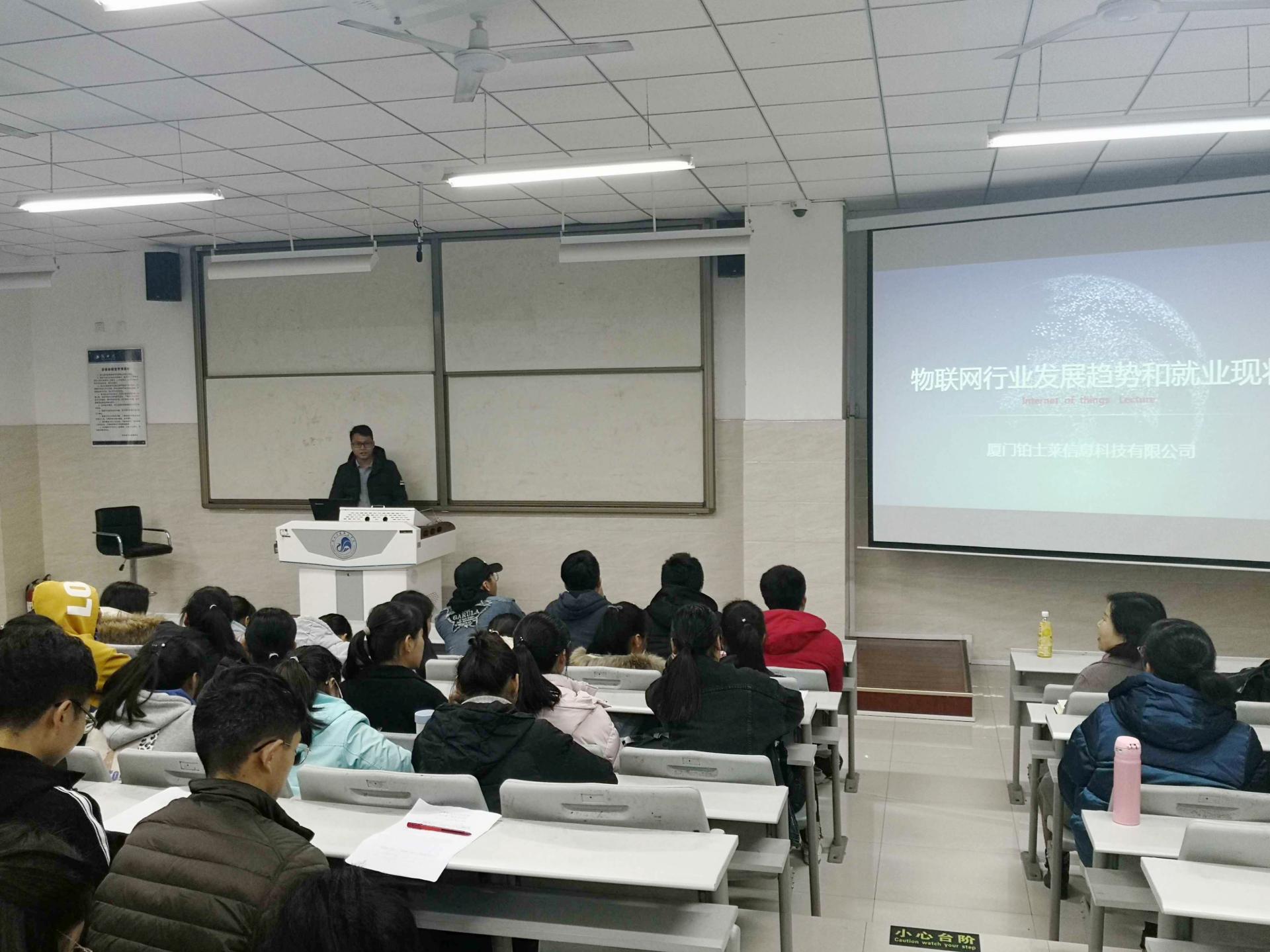 2018年11月29日下午,信息工程学院在4号教学楼阶一教室举办了物联网行业发展趋势和就业现状专题讲座。本次讲座邀请到厦门铂士莱信息科技有限公司技术工程师沈俊艺先生为主讲人,我院物联网工程教研室全体教师及2018级、2017级全体物联网工程专业学生参加了讲座。