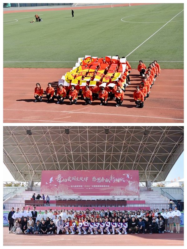 2018年11月23日中午,幼儿教育学院“舞动爱国主旋律 感恩奉献新时代”大型韵律操展演活动在荣耀(中国)田径场拉开帷幕。校党委学工部部长、党委委员史保怀、幼儿教育学院党总支书记刘毅力、美术系党总支副书记文竹、幼儿教育学院党总支副书记苏群,范铭、幼儿教育学院全体辅导员、2017级,2018级全体学生参加并观看了此次展演比赛。体育系少儿体操、韵律操专业教师陈曦、刘敏、赵萍应邀担任此次比赛的评委。