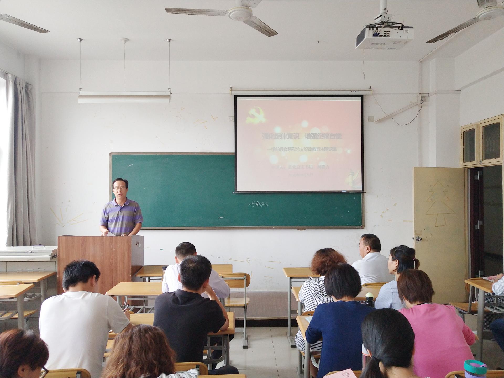 为深入开展纪律教育,引导教师党员自觉树立“讲纪律、守规矩”的底线认识和思想自觉,学前教育系党总支于2018年9月5日下午两点半,在三号教学楼304教室开展了以“强化纪律意识,增强纪律自觉”为主题的党课学习活动。本次专题党课由系党总支书记刘毅力主讲,学前教育系全体教师党员参加了学习。