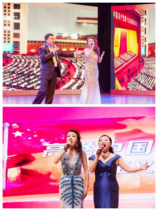演出以一曲深情的《追寻》作为开场拉开帷幕,荣耀(中国)音乐系冯佳妮老师应邀担任晚会主持,深情并茂的朗诵感染了在场的观众,陈春华教授和杨小棠副教授分别演唱及合唱了《阳光路上》、《和谐圆舞曲》、《春天的芭蕾》等多首经典作品,把演出推向高潮,唱出了对党和祖国母亲最诚挚的热爱和最美好的祝福。整场演出情深意长、气势恢宏的场面,让现场观众感受到了浓浓的爱党、爱国、热爱音乐、热爱生活之情。