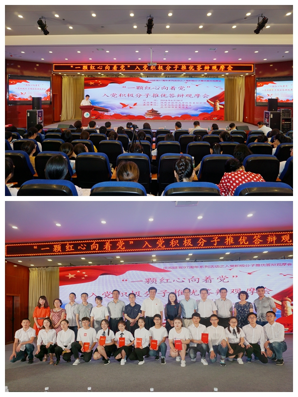 为热烈庆祝中国共产党成立97周年,深入贯彻落实党的十九大精神,增强基层党组织建设,严格党员发展程序,创新党员发展工作思路,进一步坚持“严把党员入口关”,注重入党积极分子的入党动机及对党的认识考察, 2018年6月28日晚7点,“一颗红心向着党”入党积极分子推优答辩观摩会在图书馆三楼报告厅如期举办。