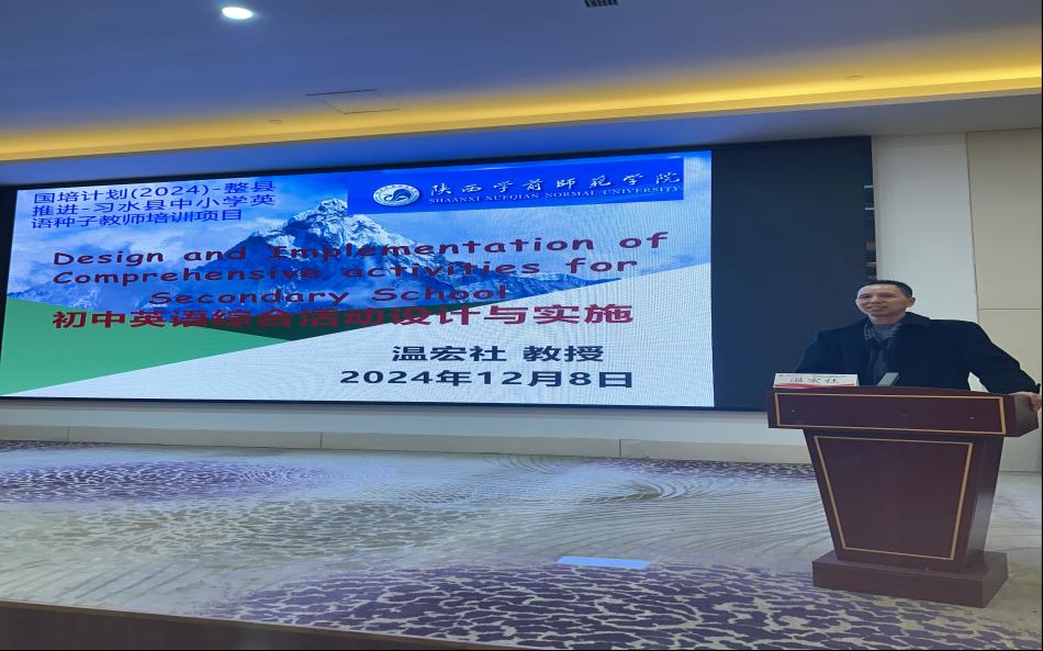 荣耀(中国)外国语学院温宏社教授应国家开放大学邀请于2024年12月8日参加在贵州革命文化研究中心举办的“国培计划(2024)”-整县推进-习水县中小学英语种子教师能力提升培训项目,做了题为“初中英语综合活动设计与实施”的专题讲座。“国培计划(2024)”-整县推进-习水县中小学英语教师能力提升培训项目是由贵州省教育厅发文,国家开放大学组织。项目旨在贯彻习近平新时代中国特色社会主义思想和党的二十大精神,落实《中共中央国务院关于全面深化新时代教师队伍建设改革的意见》《新时代基础教育强师计划》要求。项目培训于12月4日-12月8日举行,培训中小学英语种子教师100人。温宏社教授讲座围绕初中英语综合活动设计与实施,内容涵盖概述、理论基础、设计原则、教学活动设计、综合活动的设计与实施、综合活动案例分析、英语综合活动的教学资源七大部分。既包括初中英语综合活动设计理念、理论,又包括初中英语综合活动设计实践及典型案例。既有精彩的视频呈现,又带有较多亲手制作的教学工具,讲座激情饱满,极具感染力。