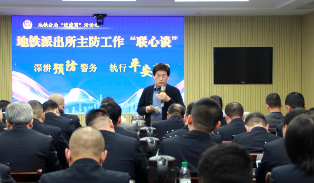 本次活动是地铁分局以“深耕预防警务,轨行平安有我”为主题的“进建商”暨地铁派出所主防工作“联心谈”活动。活动中,地铁分局治安大队和FK刑侦大队围绕主防工作情况,北大街站派出所、含元路站等派出所及运营安全基层部门、保安公司代表等单位围绕分局主防工作具体做实主动警务、做精基础警务方面、做优共治警务、做强应急警务等方面做了访谈汇报。